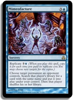 Choose target permanent an opponent controls. Search that player's library for a card with the same name and put it into play under your control. Then that player shuffles his or her library.