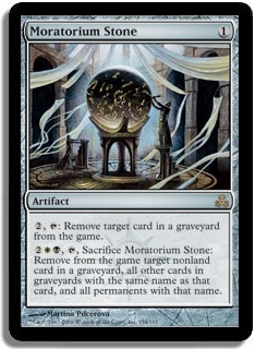 2{W}{B}, {T}, Sacrifice Moratorium Stone: Remove from the game target nonland card in a graveyard, all other cards in graveyards with the same name as that card, and all permanents with that name.