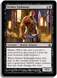 When Orzhov Euthanist comes into play or the creature it haunts is put into a graveyard from play, destroy target creature that was dealt damage this turn.