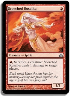 (R), Sacrifice a creature: Scorched Rusalka deals 1 damage to target player.