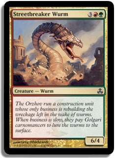 The Orzhov run a construction unit whose only business is rebuilding the wreckage left in the wake of wurms. When business is slow, they pay Golgari carnomancers to lure the wurms to the surface.