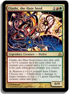 Ulasht, the Hate Seed comes into play with a +1/+1 counter on it for each other red creature you control and a +1/+1 counter on it for each other green creature you control.