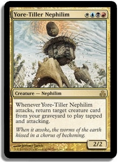 Whenever Yore-Tiller Nephilim attacks, return target creature card from your graveyard to play tapped and attacking.