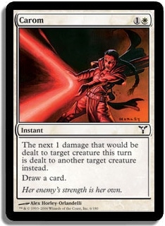 The next 1 damage that would be dealt to target creature this turn is dealt to another target creature instead.