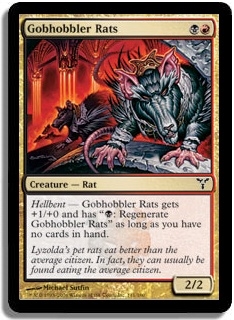 Hellbent - Gobhobbler Rats gets +1/+0 and has "{B}: Regenerate Gobhobbler Rats" as long as you have no cards in hand.