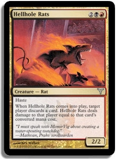 When Hellhole Rats comes into play, target player discards a card. Hellhole Rats deals damage to that player equal to that card's converted mana cost.