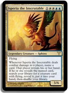 Whenever Isperia the Inscrutable deals combat damage to a player, name a card. This player reveals his or her hand. If he or she reveals the named card, search your library for a creature card with flying, reveal it, and put it into your hand. Shuffle your library afterwards.