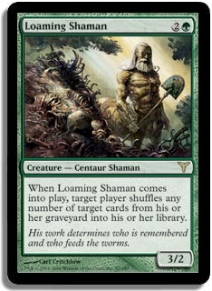 When Loaming Shaman comes into play, target player shuffles any number of target cards from his or her graveyard into his or her library.