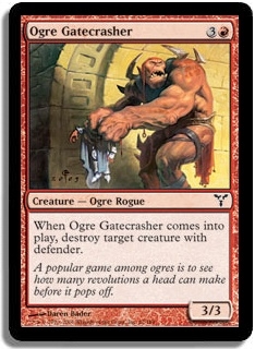 When Ogre Gatecrasher comes into play, destroy target creature with defender.