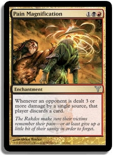 Whenever an opponent is dealt 3 or more damage by a single source, that player discards a card.