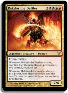 Whenever Rakdos the Defiler attacks, sacrifice half the non-Demon permanents you control, rounded up.