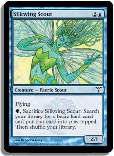G, Sacrifice Silkwing Scout: Search your library for a basic land card and put that card into play tapped. Then shuffle your library.