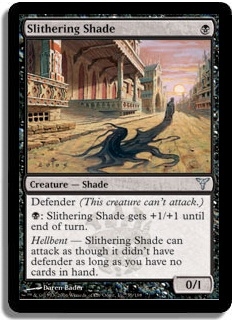 Hellbent - Slithering Shade can attack as though it didn't have defender as long as you have no cards in hand.