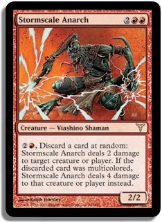 2R, Discard a card at random: Stormscale Anarch deals 2 damage to target creature or player. If the discarded card was multicolored, Stormscale Anarch deals 4 damage to that creature or player instead.
