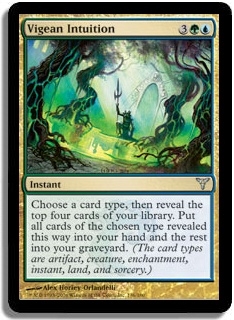 Choose a card type, then reveal the top four cards of your library. Put all cards of the chosen type revealed this way into your hand and the rest into your graveyard. (The card types are artifact, creature, enchantment, instant, land and sorcery.)