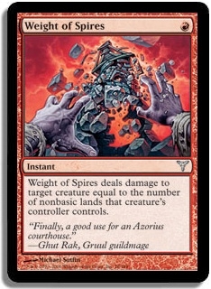 Weight of Spires deals X damage to target creature, where X is the number of basic lands that creature's controller controls.