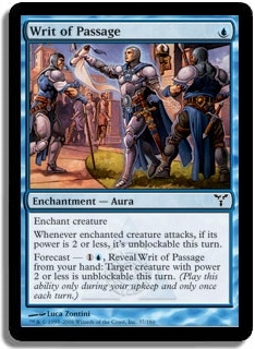 Forecast - 1U, Reveal Writ of Passage from you hand : Target creature with power 2 or less is unblockable until end of turn.