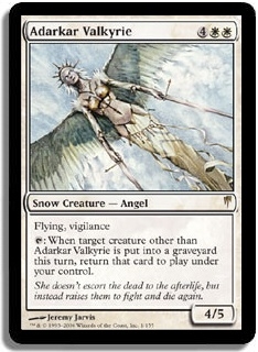 Flying, vigilance T When target creature other than Adarkar Valkyrie is put into a graveyard this turn, return that card to play under your control.