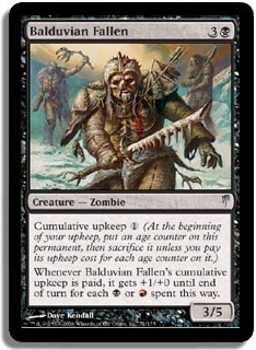 Cumulative upkeep 1 (At the beginning of your upkeep, put an age counter on this permanent, then sacrifice it unless you pay its upkeep cost for each age counter on it.) Whenever Balduvian Fallen's cumulative upkeep is paid, it gets +1/+0 until end of turn for each B or R spent this way.