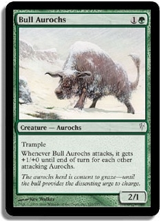 Trample Whenever Bull Aurochs attacks, it gets +1/+0 until end of turn for each other attacking Aurochs.