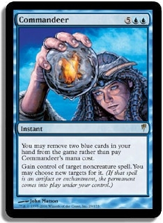 You may remove two blue cards in your hand from the game rather than pay Commandeer's mana cost. Gain control of target noncreature spell. You may choose new targets for it. (If that spell is an artifact or enchantment, the permanent comes into play under your control.)