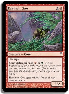 Trample Cumulative upkeep R or G (At the beginning of your upkeep, put an age counter on this permanent, then sacrifice it unless you pay its upkeep cost for each age counter on it.) Earthen Goo gets +1/+1 for each age counter on it.
