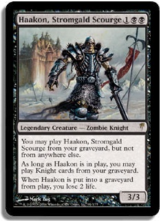 You may play Haakon, Stromgald Scourge from your graveyard, but not from anywhere else. As long as Haakon is in play, you may play Knight cards from your graveyard. When Haakon is put into a graveyard from play, you lose 2 life.