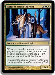 Whenever another creature comes into play under your control, put a +1/+1 counter on that creature and a +1/+1 counter on Juniper Order Ranger.