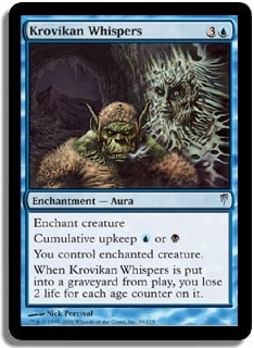 Enchant creature Cumulative upkeep U or B You control enchanted creature. When Krovikan Whispers is put into a graveyard from play, you lose 2 life for each age counter on it.