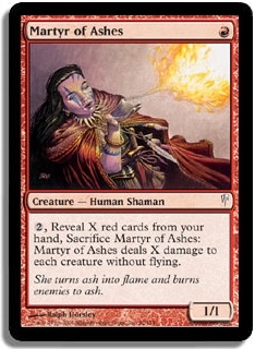 2, Reveal X red cards from your hand, Sacrifice Martyr of Ashes: Martyr of Ashes deals X damage to each creature without flying.
