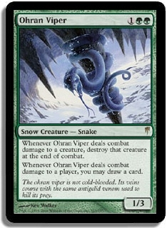 Whenever Ohran Viper deals combat damage to a creature, destroy that creature at the end of combat. Whenever Ohran Viper deals combat damage to a player, you may draw a card.