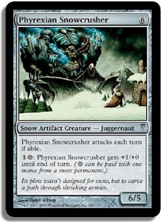 Phyrexian Snowcrusher attacks each turn if able. 1oSi: Phyrexian Snowcrusher gets +1/+0 until end of turn. (oSi can be paid with one mana from a snow permanent.)