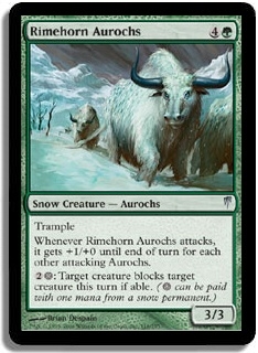 Trample Whenever Rimehorn Aurochs attacks, it gets +1/+0 until end of turn for each other attacking Aurochs. 2oSi: Target creature blocks target creature this turn if able. (oSi can be paid with one mana from a snow permanent.)