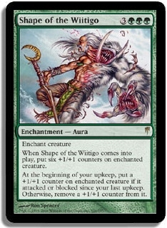 Enchant creature When Shape of the Wiitigo comes into play, put six +1/+1 counters on enchanted creature. At the beginning of your upkeep, put a +1/+1 counter on enchanted creature if it attacked or blocked since your last upkeep. Otherwise, remove a +1/+1 counter from it.