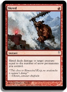 Skred deals damage to target creature equal to the number of snow permanents you control.