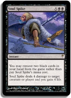 You may remove two black cards in your hand from the game rather than pay Soul Spike's mana cost. Soul Spike deals 4 damage to target creature or player and you gain 4 life.