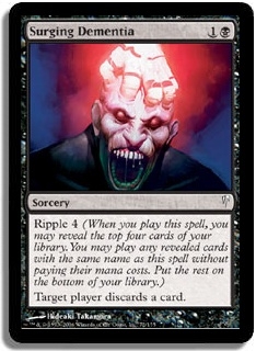Ripple 4 (When you play this spell, you may reveal the top four cards of your library. You may play any revealed cards with the same name as this spell without paying their mana costs. Put the rest on the bottom of your library.) Target player discards a card.