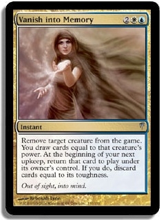 Remove target creature from the game. You draw cards equal to that creature's power. At the beginning of your next upkeep, return that card to play under its owner's control. If you do, discard cards equal to its toughness.