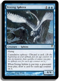 Flying Cumulative upkeep-Discard a card. (At the beginning of your upkeep, put an age counter on this permanent, then sacrifice it unless you pay its upkeep cost for each age counter on it.) When Vexing Sphinx is put into a graveyard from play, draw a card for each age counter on it.