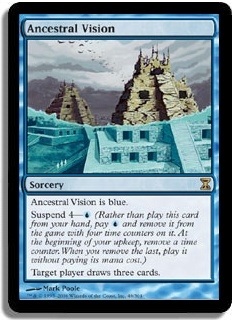 Ancestral Vision is blue. Suspend 4-U (Rather than play this card from your hand, pay U and remove it from the game with four time counters on it. At the beginning of your upkeep, remove a time counter. When the last is removed, play it without paying its mana cost.) Target player draws three cards.