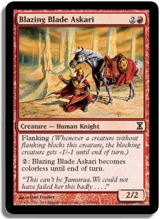 Flanking (Whenever a creature without flanking blocks this creature, the blocking creature gets -1/-1 until end of turn.) 2: Blazing Blade Askari becomes colorless until end of turn.