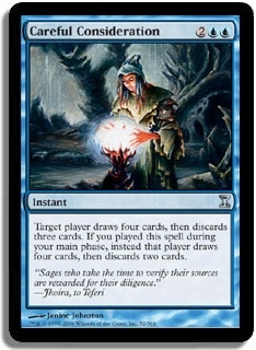Target player draws four cards, then discards three cards. If you played this spell during your main phase, instead that player draws four cards, then discards two cards.
