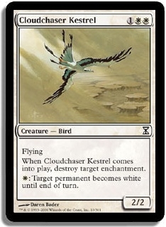Flying When Cloudchaser Kestrel comes into play, destroy target enchantment. W: Target permanent becomes white until end of turn.