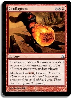 Conflagrate deals X damage divided as you choose among any number of target creatures and/or players. Flashback-RR, Discard X cards. (You may play this card from your graveyard for its flashback cost. Then remove it from the game.)