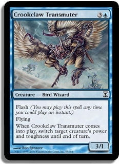 Flash (You may play this spell any time you could play an instant.) Flying When Crookclaw Transmuter comes into play, switch target creature's power and toughness until end of turn.