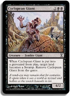 When Cyclopean Giant is put into a graveyard from play, target land becomes a Swamp. Remove Cyclopean Giant from the game.
