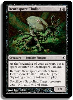 At the beginning of your upkeep, put a spore counter on Deathspore Thallid. Remove three spore counters from Deathspore Thallid: Put a 1/1 green Saproling creature token into play. Sacrifice a Saproling: Target creature gets -1/-1 until end of turn.