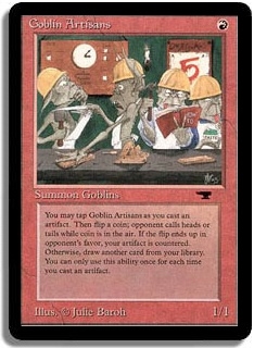 You may tap Goblin Artisans as you cast an artifact. Then flip a coin; opponent calls heads or tails while coin is in the air. If the flip ends up in opponent's favor, your artifact is countered. Otherwise, draw another card from your library. You can only use this ability once for each time you cast an artifact.