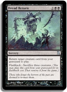 Return target creature card from your graveyard to play. Flashback-Sacrifice three creatures. (You may play this card from your graveyard for its flashback cost. Then remove it from the game.)