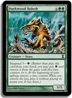 Suspend 5-G (Rather than play this card from your hand, you may pay G and remove it from the game with five time counters on it. At the beginning of your upkeep, remove a time counter. When the last is removed, play it without paying its mana cost. It has haste.)